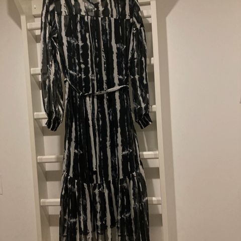 Kerran käytetty mekko laskeutuvaa viskoosia. Kokomerkintä 38 mutta menee paremmin 40 kokoiselle. Reilu malli. Runsaat hihat. Virheetön.