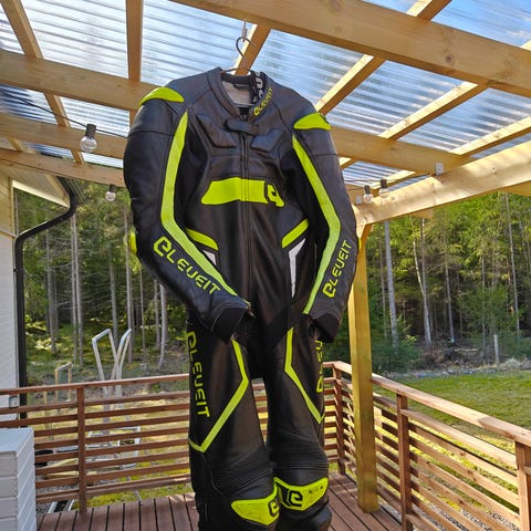Kaksi kertaa päällä ollut 2-osainen nahkapuku kunnollisilla suojilla. Takkia voi käyttää myös erikseen. Mukaan irtonainen selkäsuoja. Koko 48.