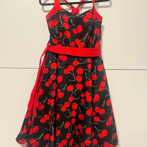 Kirsikkakuvioinen kellohame koko 46.Niskalenkki,takana yläosassa kuminauha.Vyötäröllä nauha,helmassa punainen pitsi.97%puuvillaa 3%elastaania.