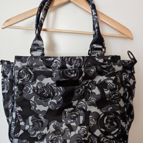 Jovi hoitolaukku, siisti, hyväkuntoinen. Ulkotasku, sisällä 3 pikkutaskua, ulkona päädyissä taskut, vetoket-julla suljettava. Hihnassa nepparit, joilla voi kiinnittää vaunujen kahvaan. Leveys 36 cm, korkeus 25 cm, leveys 9 cm.