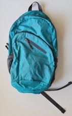 Reppu. väri turkoosi. Nylon kangasta, uuden veroinen. Korkeus noin 44 cm, leveys noin 30 cm, pohjan 13 cm. 2 isoa vetoketjullista lokeroa, isoimmassa lokerossa vetoketjullinen tasku, 2 pienempää vetoketjullista lokeroa molemmissa sivuissa lokero esim. juomapullolle. Ehjä, siisti. Kuva 2 takaa.