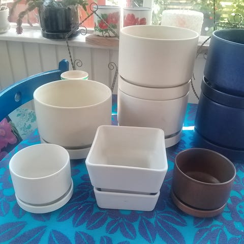 Kuvienmukaiset hyväkuntoiset ja täysin ehjät käytetyt Arabian kukkaruukut. Joissakin on kalkkitahroja, mutta seuraava putsaa paremmin, jos häiritsee :)