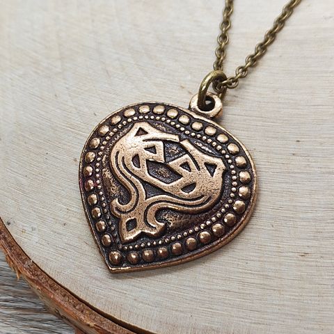 Pronssia Kalevala Koru. Ketjun voi vaihtaa, tätä lyhennetty, jotta istuu kaulalle paremmin. Ketjun korkeus 'kaksinkertaisena' noin 21 cm eli kokonaispituus tämä tuplaten.