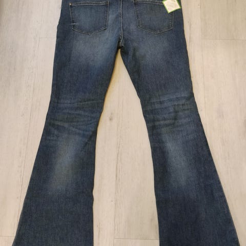 Paksuhkoa farkkua, vyötärö joustaa, noin 61 cm puolikas siinä. Sisäpituus 73cm lahkeessa.