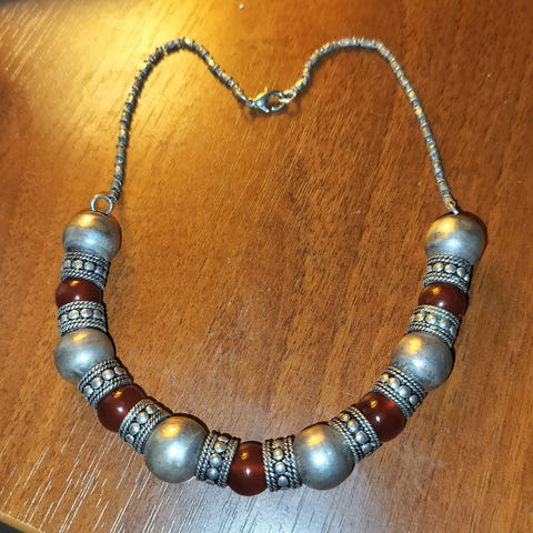 Hyvin vanha filigree kaulakoru. Koru on todella isokokoinen. Posliini osa ja pienet turkoosit kivet. Materiaali näyttää hopealta? Mutta ei leimoja, joten en ole varma.