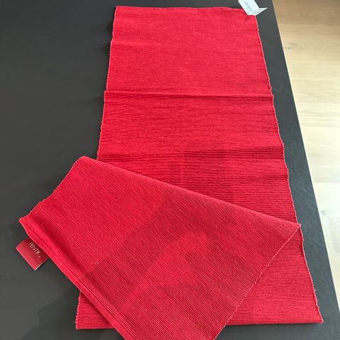 Joulunpunainen kaitaliina valkoisin hapsuin.