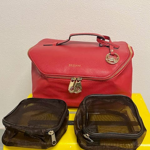 Iso tekonahkainen laukku, n.30 cm korkea ja 18 cm leveä Oriflame-logolla. Vain nouto!