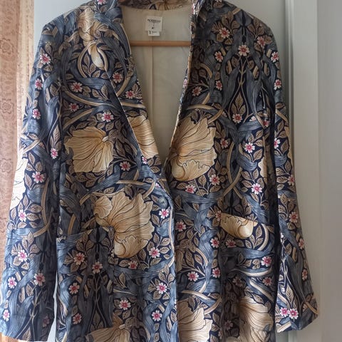 Talking French koristeellinen bleiseri. Ranskalainen koko 36 vastaa EU-kokoa 34. Naisellinen, linjakas malli. Kauniit pronssinväriset brodeeraukset kaula-aukon ympärillä, hihansuissa ja taskujen läpissä. Materiaali on eläväpintaista 100% puuvillapopliinia. Kerran pesty, oikein hyväkuntoinen.