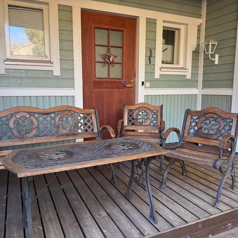 Hyväkuntoiset terassikalusteet muovipyörillä ja pehmusteilla.
