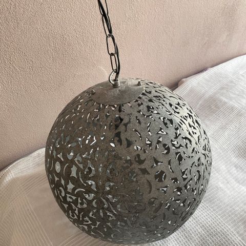 Mattamusta kattovalaisin, jossa kullan hohtoinen sisäpuoli. Kangaspintainen, pitkähkö johto. Halk n. 31 cm.