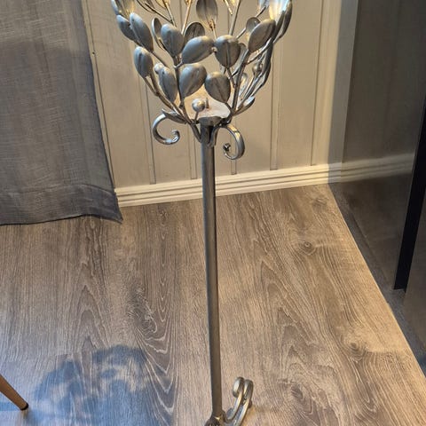 Noin metrin korkea, maalattu metallinen. Sopii pienille kukkapurkeille tai tuikku kynttilät, pienet metalli laatat 5cm halkaisija. Hopean harmaa. Vain nouto, Härkämäki. Käteinen