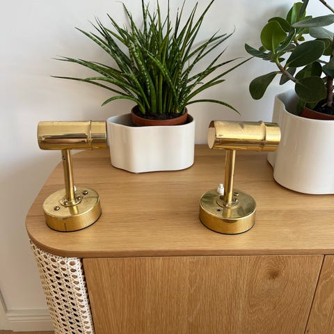 Messinkiset seinävalaisimet 2 kpl 1970-luvulta ovat Jonas Hidlen suunnittelemat ja norjalaisen Hövik Lysin valmistamat, myydään 250eur per valaisin ,ja molemmat 500eur