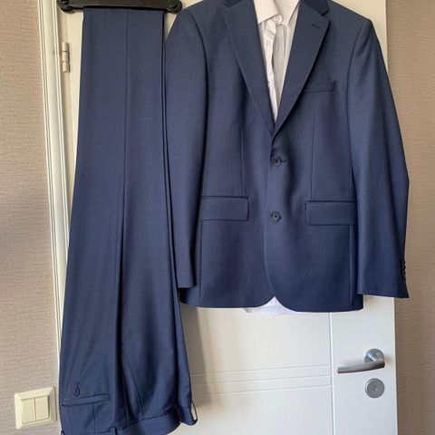 Myydään puvuntakki, puvun housut ja valkoinen kauluspaita mallia slim fit. Kaksi kertaa käytetty, hyväkuntoinen puku nuorelle.