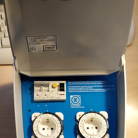 Uusi ja käyttämätön autonlämmitysrasia. Sisältää ajastinkellot kahdelle lämmityspistokkeelle sekä asianmukaisen vikavirtasuojan ja johdonsuojakatkaisijat. Jäänyt rakennusprojektista yli.