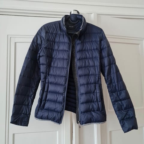 Naisten navy/tummansininen kevyttoppatakki. Moitteeton kunto. Upeat hopeiset/tumman kiiltävät yksityiskohdat ja resorit. Koko s. Untuvatakki.