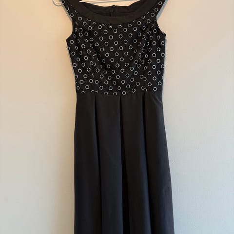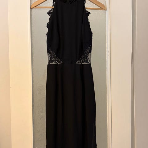 Musta juhlamekko. Selkä "avonainen" niskaan asti harsoa. Edessä koristekivikirjailu. Vetoketjukiinnitys. Niskan pääntien tikkaus osin purkaantunut. Ei näy käytössä, mutta helppo halutessaan korjata. Kangas jämäkkää mutta joustaa hieman. vy 60cm, ly 77cm ry 72cm. Sivussa vetoketju.