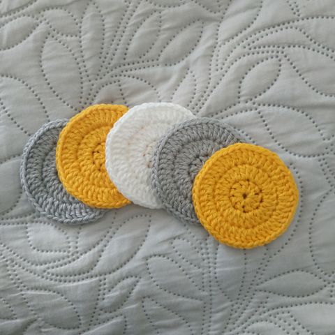 Viisi kappaletta virkattuja kestovanulappuja. Käytettyjen lankojen tiedot löytyy kuvista sekä pesuohje. 100% puuvillaa.