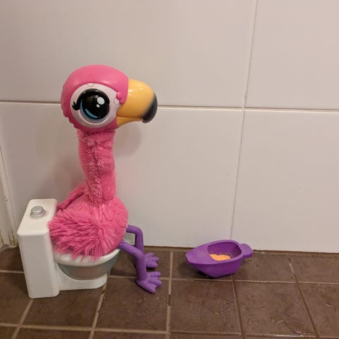 Laulava flamingo. Se toistaa sanomasi. Laulaa lauluja ja tanssii. 😅 Se myös kakkaa vessanpönttöön, mutta kakkaamiseen tarkoitettu hiekka on loppu. Voit käyttää siihen muiden lelujen muovihiekkaa.