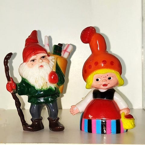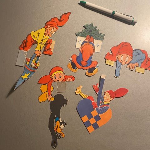Tosi vanhoja vähä revenny ja teipattu. Jalkojen kaikki tupsut teipattu. Teipin jälkiä. Ollut vanhan kaupan rekvisiittaa. Olisko tää joulupukki k-kaupan.