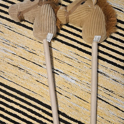 Kaksi hyväkuntoista käytössä olleita keppihevosta.