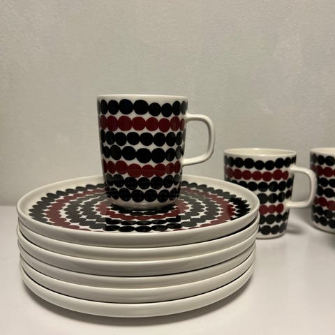 Myydään 4 kpl mukeja, lautasia sekä kulhoja. Kaikki kerralla.
