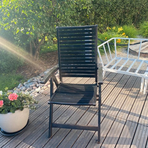 Laadukas Varax Julia puutarhatuoli. Ehjä ja jämäkkä. Kokoontaitettava, joten on helppo varastoida. Aurinko on kuluttanut, joten voi hioa ja käsitellä jos haluaa siistimmäksi.