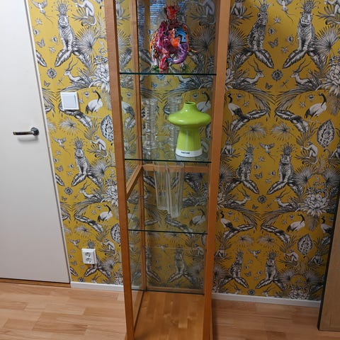 Kaksivärinen lasivitriini. Hieman kulumaa, mutta vielä komia!