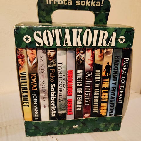 Kuvassa näkyvä boksi leffoineen. Ostajalle postit ellei nouto.