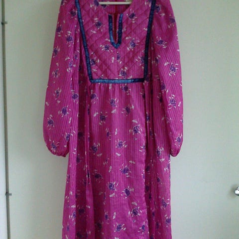 Kaisu Heikkilä Oy:n vintage mekko 1970-luvulta koko 40. Annan mittoja eli kai-kai noin 48cm, olka-helma 140cm. Rinnan alta saumakohdasta ympärys 82cm. Edessä nyörit, joilla voi rintojen kohdalta kiristää tai väljentää. Materiaali 100% puuvilla. Pienet, mitättömät tahrat kauluksessa.