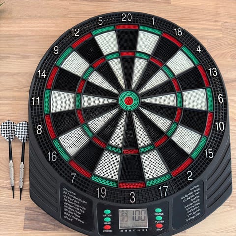 Digitaalinen darts-taulu, jossa ohjekirja, tikkoja ym mutta muuntaja on hukassa. Jos jollakulla on sellainen tai osaa ostaa oikeanlaisen, niin toimii mut toki voi heitellä ilman ääniä ja automaattista pistelaskentaa. Kuvissa on myös suomalainen huoltonro, josta varmasti osataan sanoa, mistä saa ostettua muuntajan. Kuvissa lisätietoja. Korkeus 52cm.