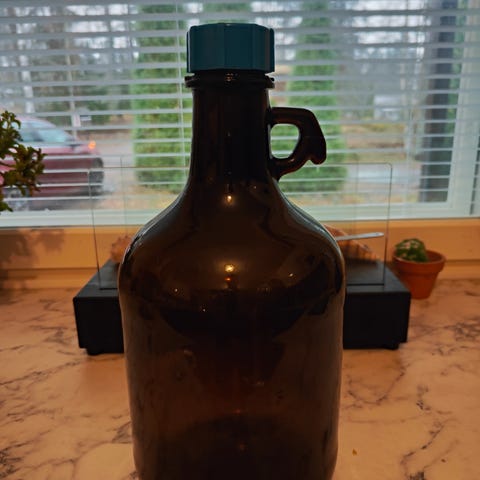 Vanha lasinen infuusiopullo muovisella kierrekorkilla. Mitta-asteikko (100ml) oikein päin 200-1000ml ja korkki alaspäin 100-900ml. Hauska myös karahviksi / kaatimeksi.