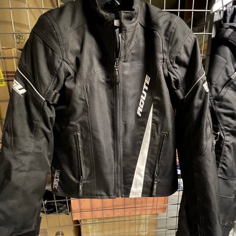 Suojat olkapäissä, kyynärpäissä ja selässä. Vähällä käytöllä ollut. Siisti ja ehjä takki. Mutoon leikattu malli joka kokoa 42.