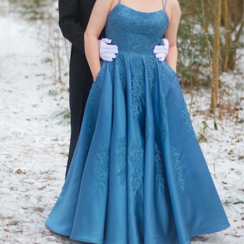 Todella tyylikäs ja elegantti turkoosin värinen (vihreänsininen) vanhojentanssimekko. Kimaltelee hienosti salamavalojen loisteessa.
