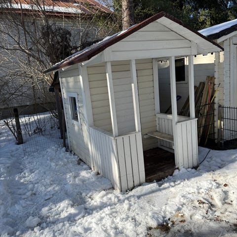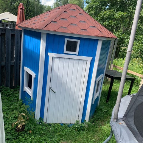 Lasten leikkimökki, jossa palahuopakatto uudenveroinen. Ovi, 2 ikkunaa. Ulkoseinissä sekä sisällä lasten maalauksia. Tosi painava, vain nouto.