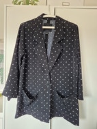 Monkin musta bleiseri, jossa valkoisia palloja. Oversize-mallia. Ei vuorta. Edessä taskut ja yksi nappi. Oikean hihansuun sauma purkaantunut puoliksi, mutta sen voi ommella kiinni. Muuten hyvässä kunnossa, ei reikiä tai muita vikoja. Koko S. Kainalo-kainalo 52 cm, olkapää-helma 73 cm. Materiaali 100% polyesteria.