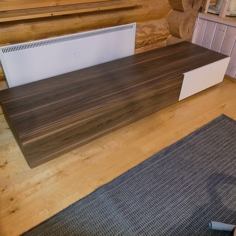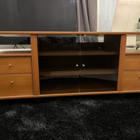 TV-taso puusävy. Tilava TV-taso, jossa on useita säilytyslokeroita ja kaksi vetolaatikkoa. Sopii erinomaisesti olohuoneeseen tai viihdekeskukseen. Helppo ylläpitää siistinä!