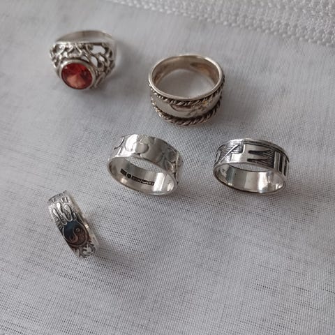 Erikokoisia hopeasormuksia, lähes käyttämättömiä. Hinnat 20-30€/kpl