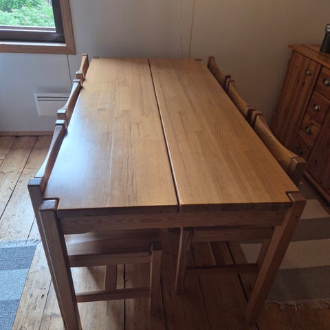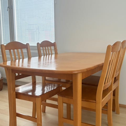 lmari Tapiovaaran suunnittelema ja Laukaan puun valmistama Hongisto ruokailuryhmä neljällä tuolilla.