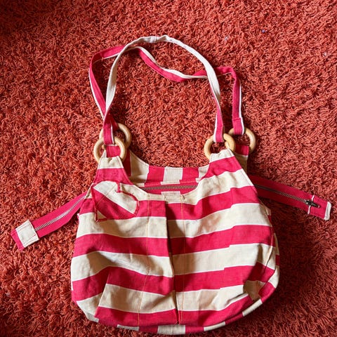 Koko n. 32x20 cm. Sivutaskuja sisällä. Käytetty mutta täysin ehjä ja siisti. Muutamia naarmuja laukun etuosassa