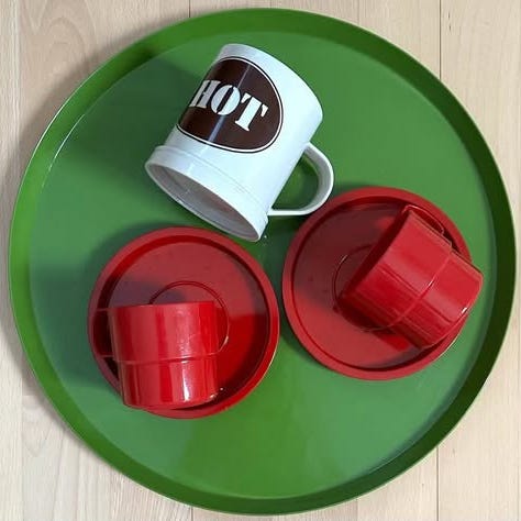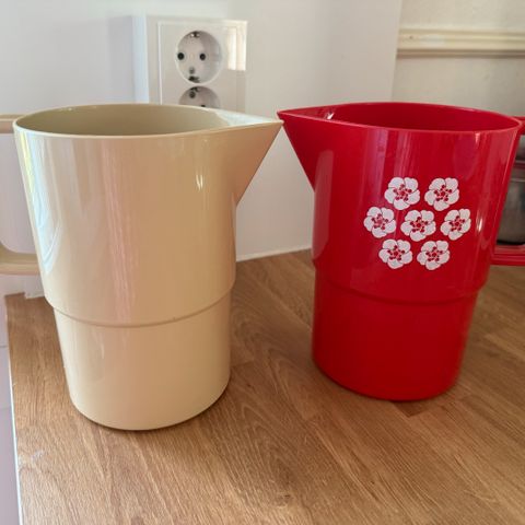 Vintage retro vanha wanha sarvis sarvikset sarviksen kermakko kermakot kannu kaadin pikkukaadin värikäs retrot muovi muovia muovinen retki mökki mökille muoviastia muoviastiat