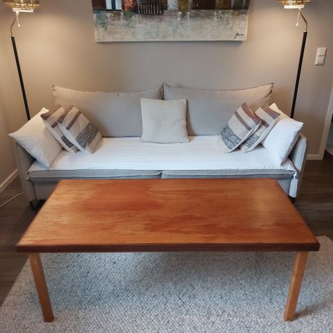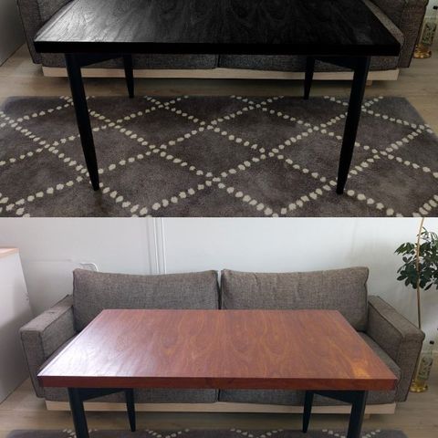 Väri: Monisävyinen tiikkinen pöytälevy ja mustat jalat