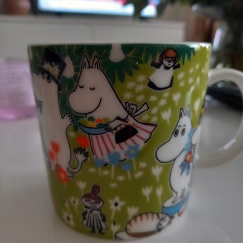 Käyttämätön virheetön muumimuki ilman rillejä.