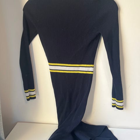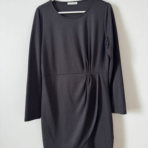 Musta mekko erittäin hyvässä kunnossa, kainalo-kainalo 55cm, epäsymmetrinen pyöreästi loivasti ylöspäin leikattu helma edessä, takapituus niska helma 117cm, eripituisia kaula-aukon alareuna-helma 90cm. Edessä rinnan kohdalla laskos, joka tekee mekosta loivasti A-linjakseni. Materiaalilappu puuttuu, tn puuvillasekoitr.