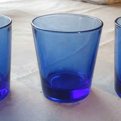 Kauniit sini jalalliset lasit. Kuusi lasia. Siistit ja ehjät.