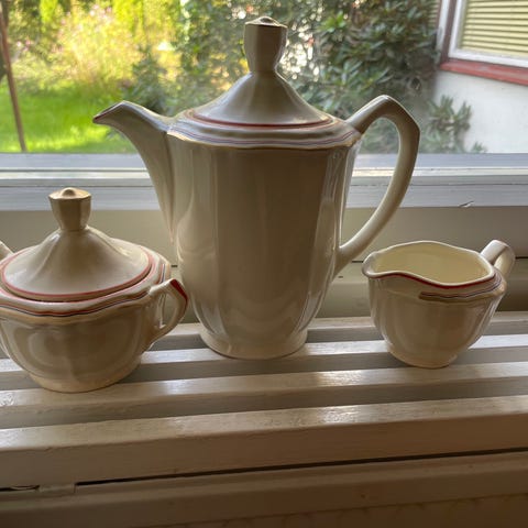 Arabia käsinmaalattu kulmikas pieni kannu / kermakannu, korkeus 10,0cm, halkaisija n. 8 cm, piippuleima. Tuotannossa 1932 - 1949.
