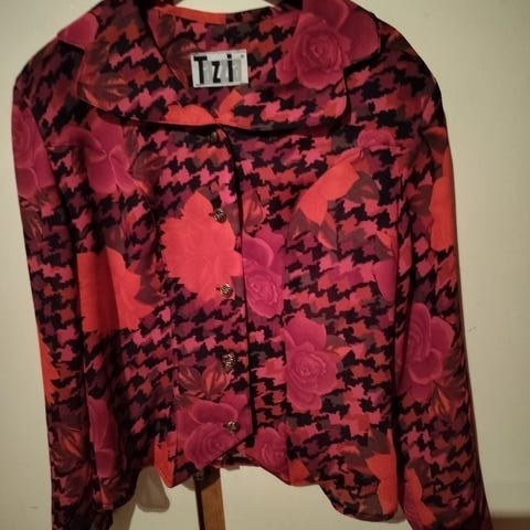 Punavalkoinen paita, muodikas pallokuvointi. Valkoiset pallot punaisella pohjalla. Paidan takapuolella napit. 100 % viskoosi. Kuin uusi.