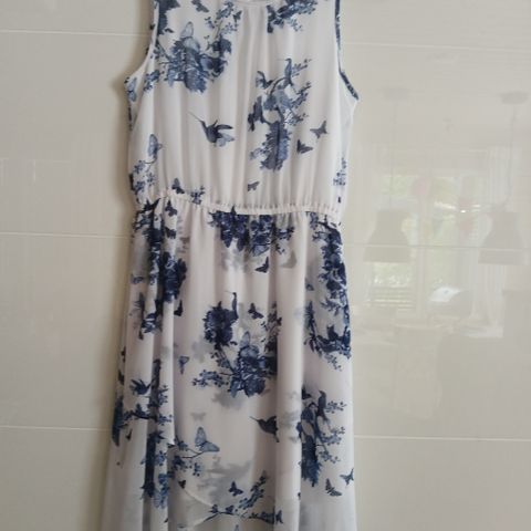 H&M:n pastellineonsävyinen mekko, jonka päällyspitsissä kukka- ja lehtikuosia. Alla täyspitkä, valkoinen vuorikangas. Somisteena vaaleanvioletti, joustava vyötärönauha. Koko 170, hyväkuntoinen.