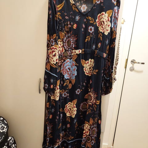Kaunis Creamin merkkinen tummansininen kukkamekko. Käyttämätön. Kai-kai 54 cm, vyötärö 90 cm, kumi ei paljon jousta, hiha 63 cm, olka-helma 132 cm. Hamessa halkiot.