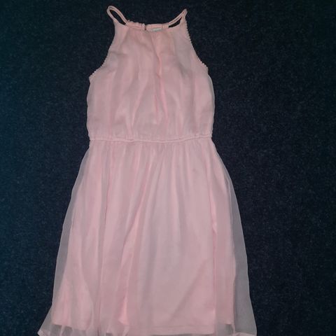 Lindexin vaaleanpunainen/ruusukullanvärinen samettimekko, jonka kuosissa mustia ruusuja. Halterneck-kaulus, jonka kiinnitys kahdella napilla. Varanappi kiinni pesulapussa. Koko 146/152, hyväkuntoinen.