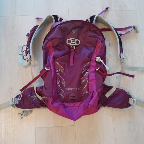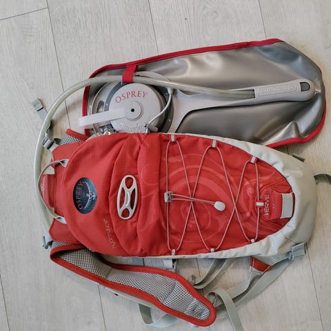 Osprey tummanpunainen saumaton sadesuojus noin 20-40 litran repuille. Pyöreä kuminauha kiristimellä, kuminauhakäytävä, tarranauha reppuun kiinnitystä varten.